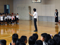 前期も8日で終わり、明日からは秋季休業日です。終業式では、先ず始めに、新しく来られた先生の紹介があり、次に校長先生からのお話がありました。その後で科学賞の表彰を行いました。最後に、児童会からあいさつについての取り組みの説明がありました。